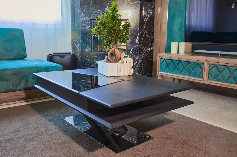 Rectangular coffee table in black pepper color essence finish and lower support plate in polished nickel. The upper compartment can be opened.