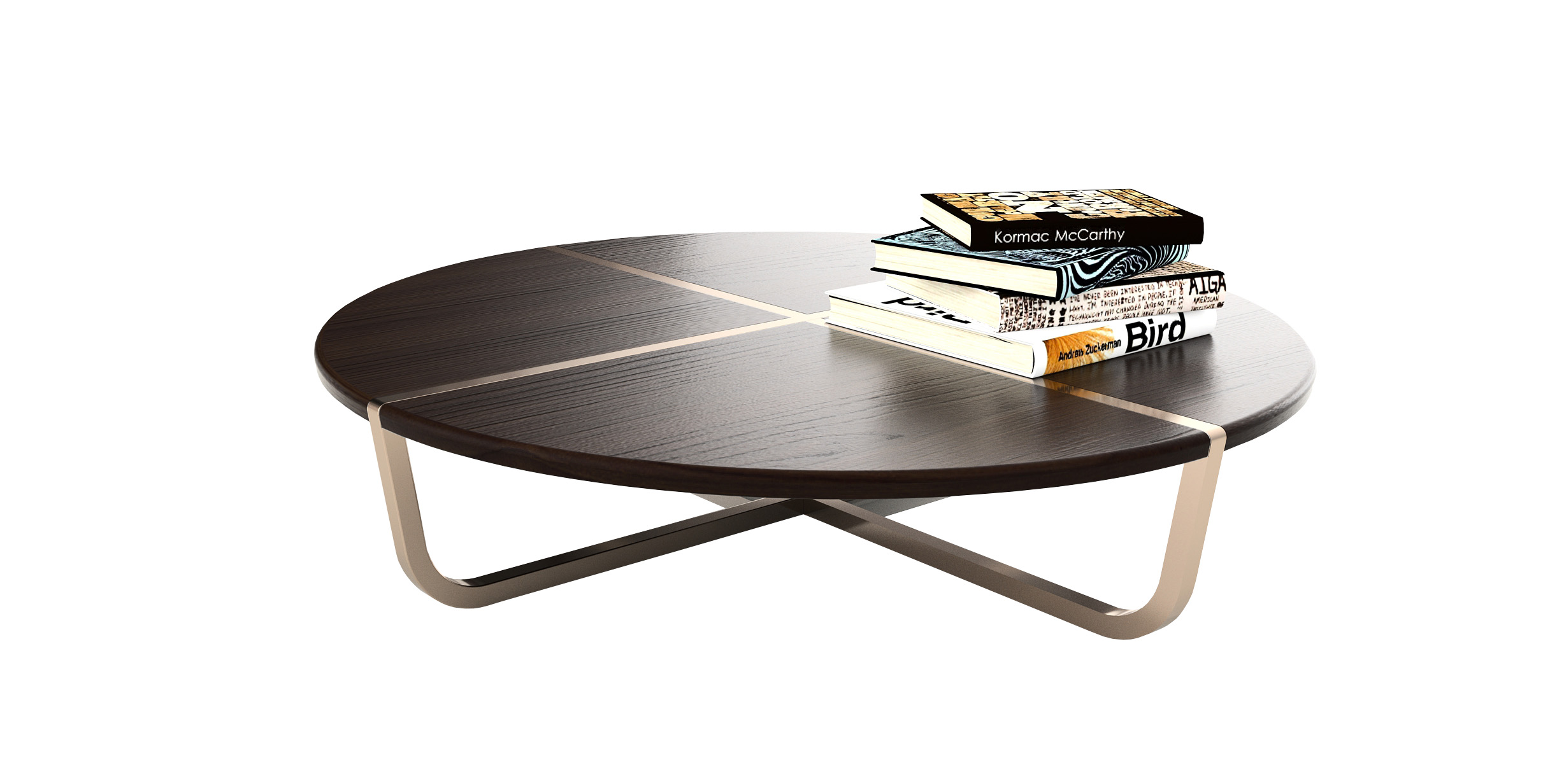 Round coffee table in wengè stained oak with copper painted metal structure.